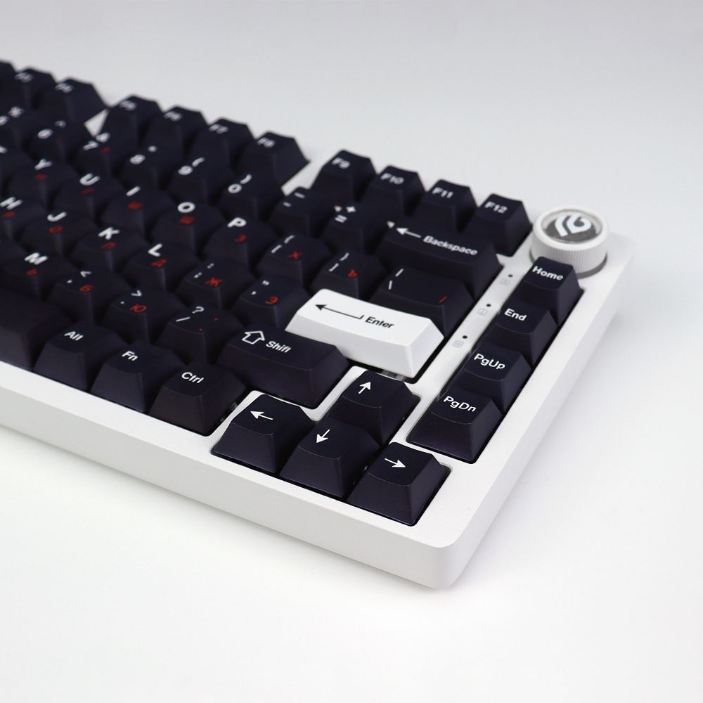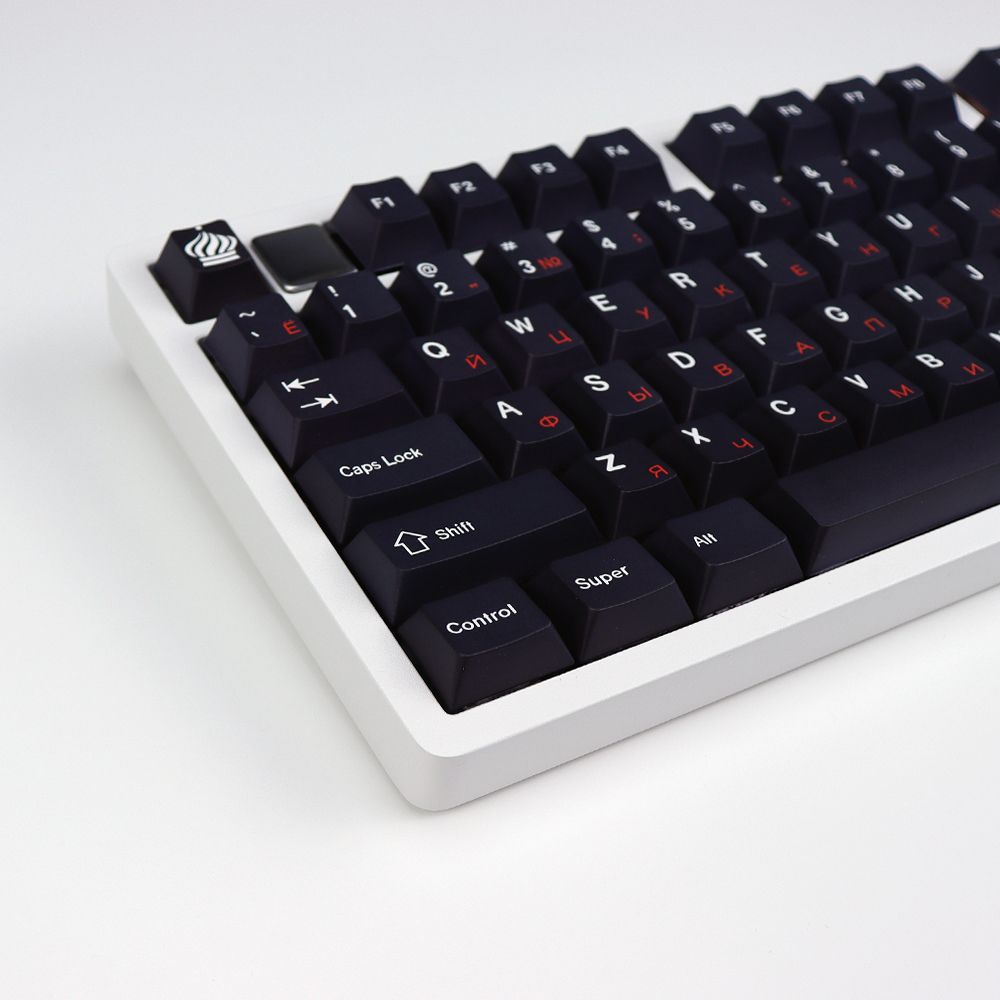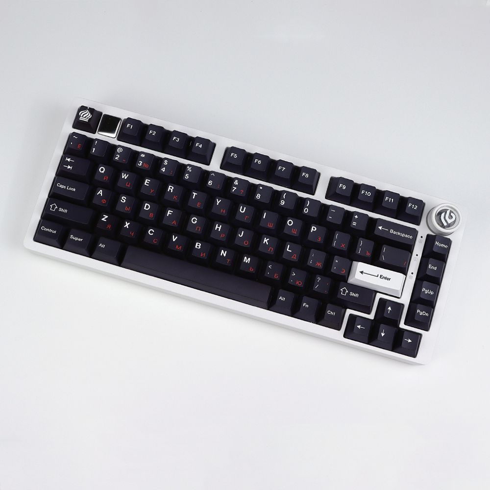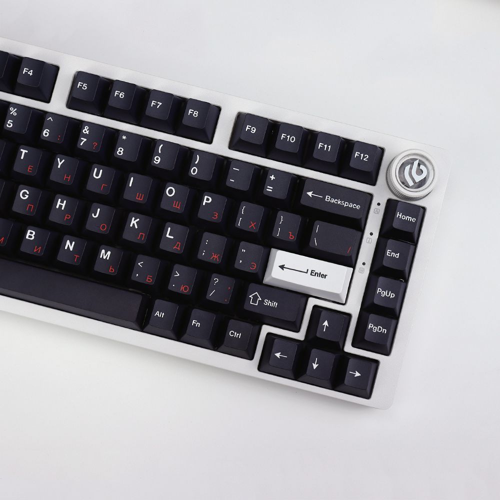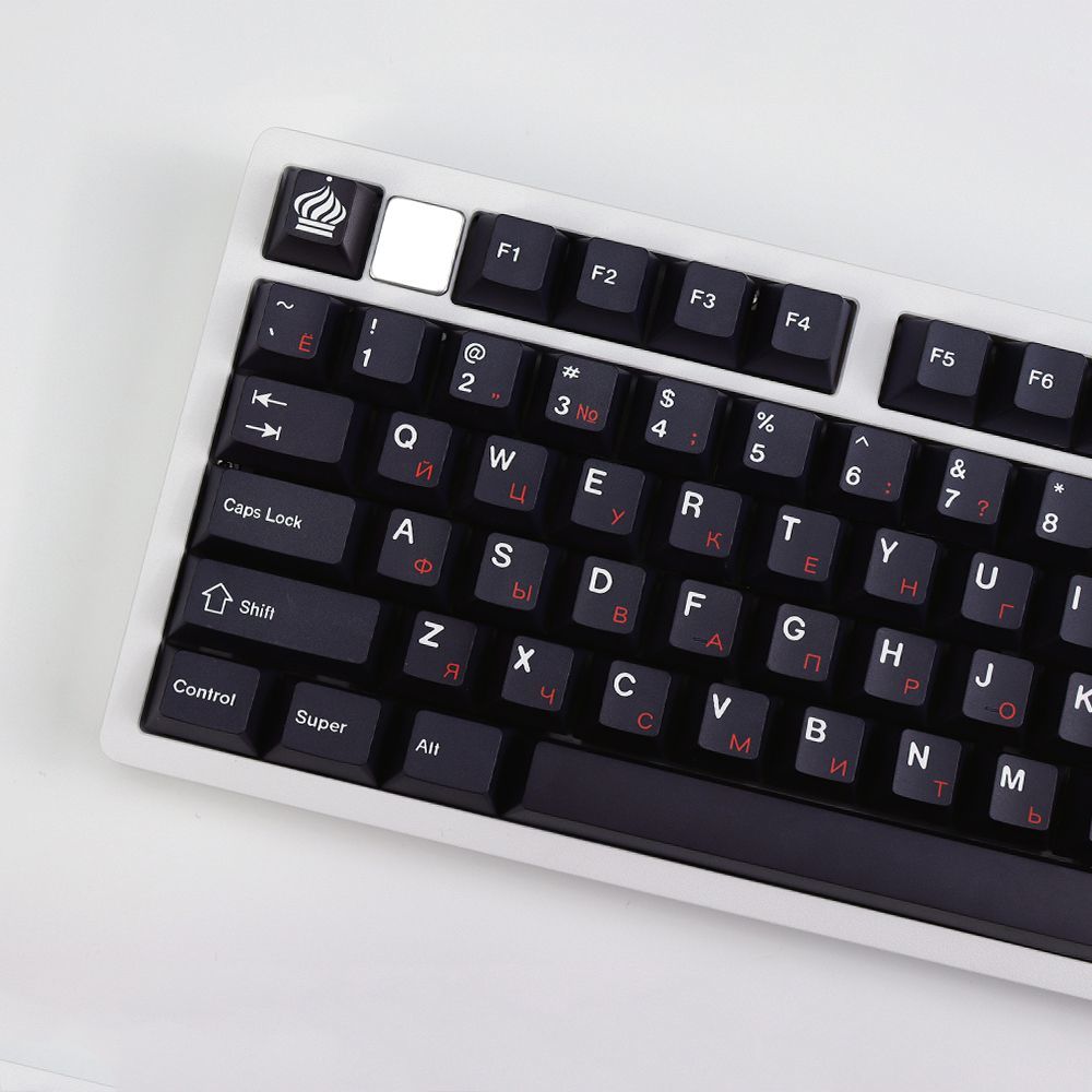 The KBDiy GMK Red Cyrillic keycap set features a bold black base with striking red Cyrillic sub-legends, delivering a sharp and distinctive aesthetic. Designed for enthusiasts who appreciate bilingual layouts and high-contrast styling, this set balances visual impact with everyday usability.
